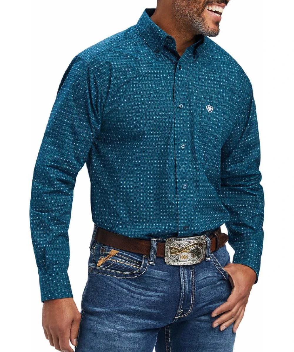100% Cotton; Long Sleeve; Button Down Collar And Placket; Single Open Chest Pocket With Logo Embroidery; Straight Back Yoke With Logo Embroidery; Two-Button Adjustable Cuffs; Woven Placket Label; Greater Arm Mobility; Color: Oahu Teal Geo Print; Style #10041743