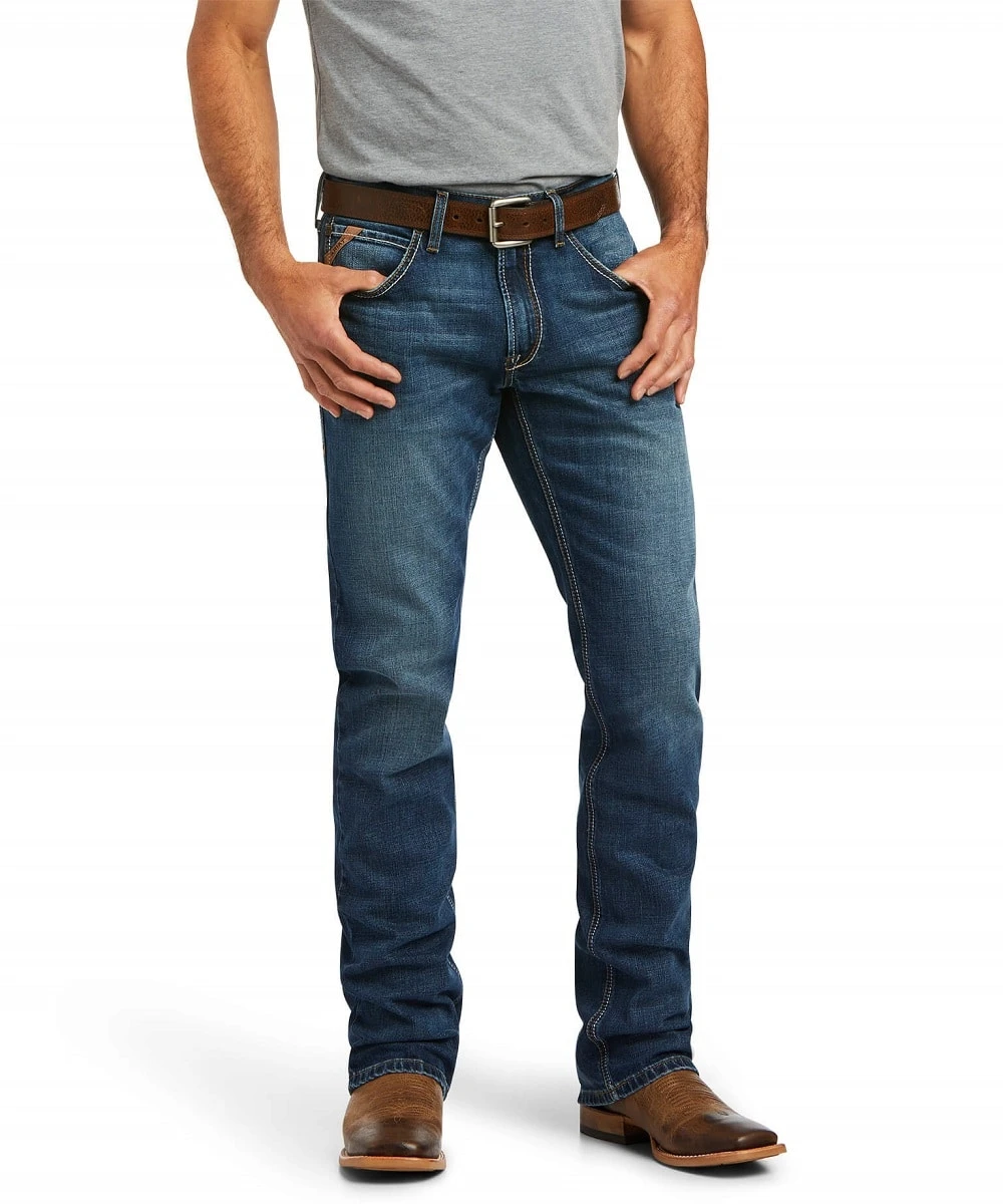 99% Cotton/1% Spandex, 13.5 Oz. Ring Spun TekStretch Denim; Sits Below The Waist; Straight Through Seat And Thigh; Whiskers; Fading; Extra Deep Front Pockets; Heavy Duty Zippers And Hardware; Anchored Belt Loops; Loop Lock Reinforced Rear Belt Loop; No Rub Comfort Inseam; Straight Leg Opening; Style #10040124