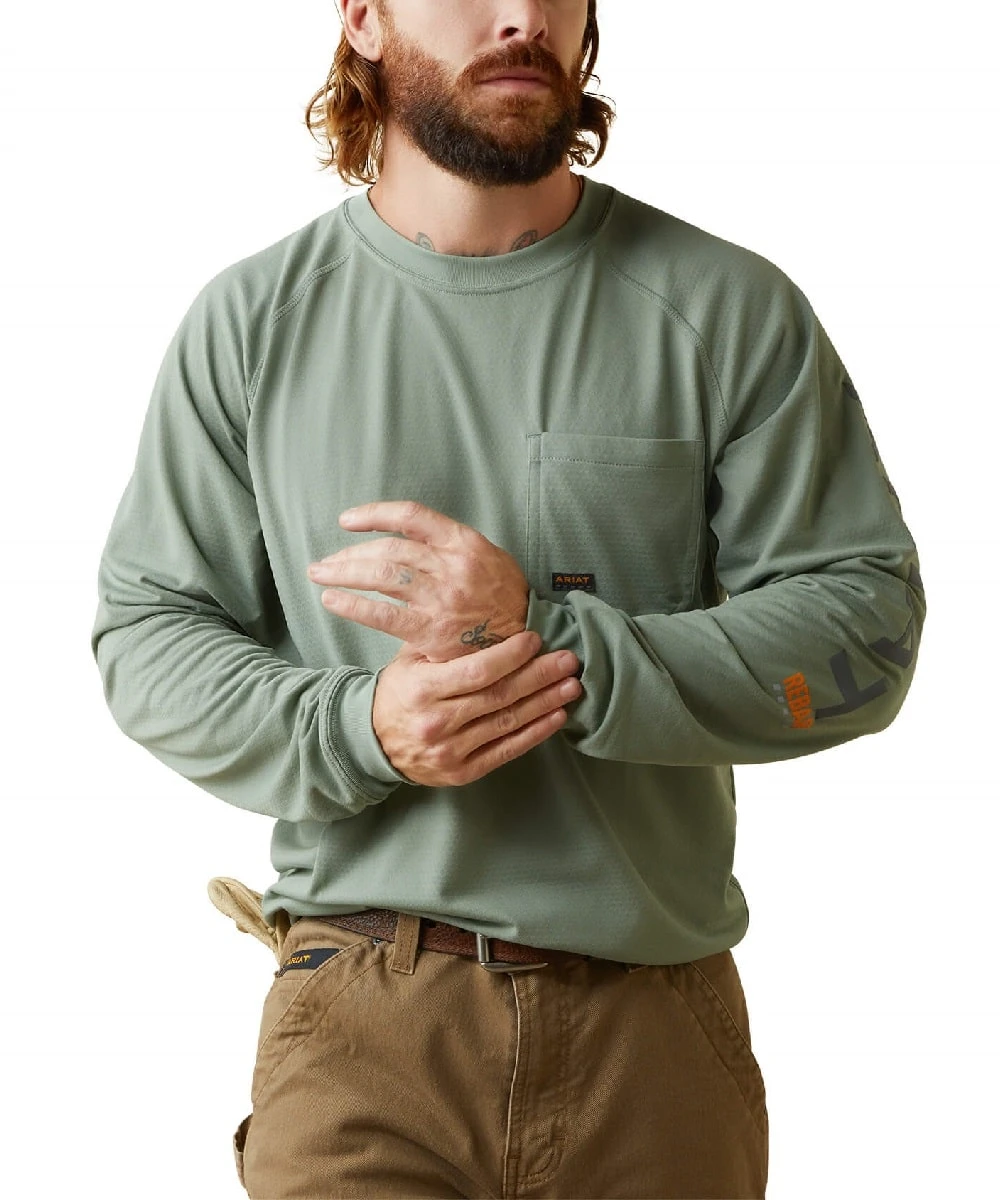 100% Eco Responsible Polyester, 4 Oz. Lightweight Mesh; Long Sleeve; Greater Arm Mobility For Maximum Range Of Motion; Moisture Movement Technology Wicks Moisture Away From Skin; FreshTEK Fabric Inhibits Growth Of Bacterial Odors; Droptail Hem; Ribbed Collar And Cuffs; Front Open Chest Pocket; Ariat Logo Print On Left Arm; Color: Lily Pad/Periscope; Style #10043541