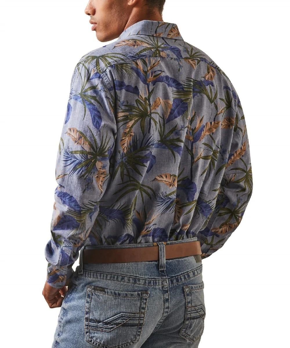 96% Cotton/4% Spandex; Performance Stretch Fabrication; Long Sleeve; Wrinkle Resist Fabric; Button Down Collar; Button Cuffs; Single Open Pocket; Greater Arm Mobility For Freedom Of Movement; Straight Back Yoke; Color: Chambray Blue With Palm Print Design; Style #10043710