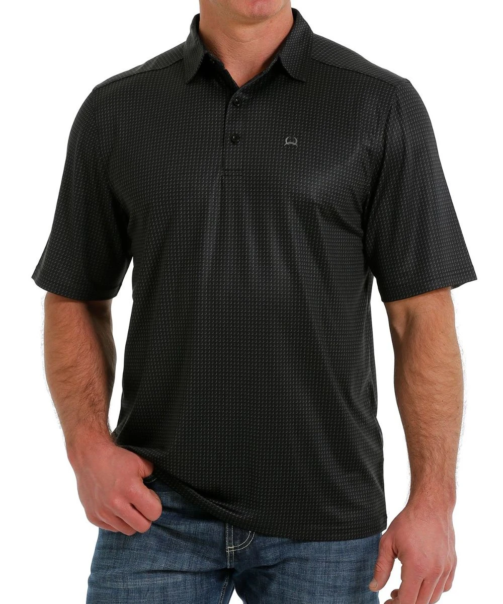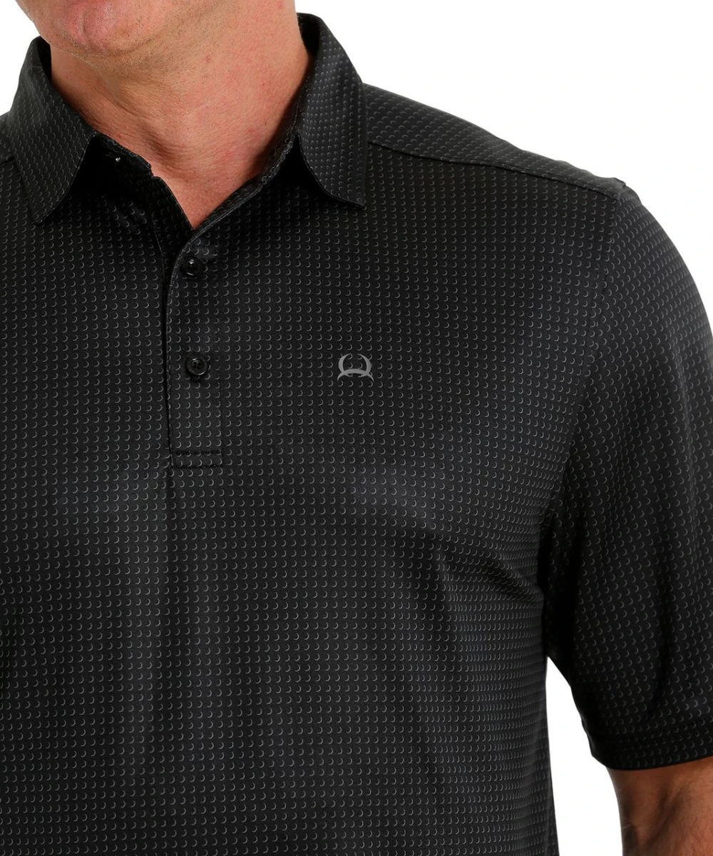 Lightweight Poly/Spandex; Short Sleeve Polo; Spread Collar; Three Button Placket; Black Buttons; Logo Heat Transfer On Chest; Moisture Wicking; Color: Black With Sublimated Print; Style #MTK1863022