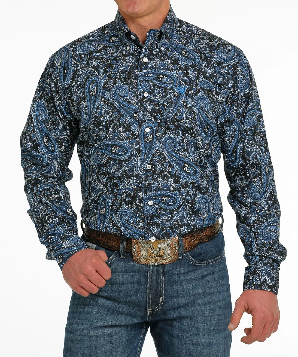 Printed Plain Weave Cotton; Classic Fit; Long Sleeve; Button Down Collar, Placket, And Cuffs; Cream Buttons; Single Open Chest Pocket With Logo Embroidery; Color: Navy/Blue/Cream Paisley Print; Size: 3X; Style #MTW105517X