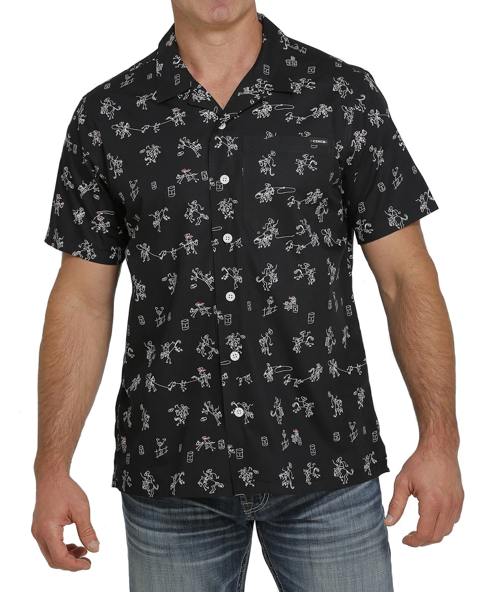 100% Cotton; Short Sleeve; Spread Collar; Button Down Front; Single Open Chest Pocket With Logo Embroidery; White Cowboy Print; Color: Black; Style #MTW1401012