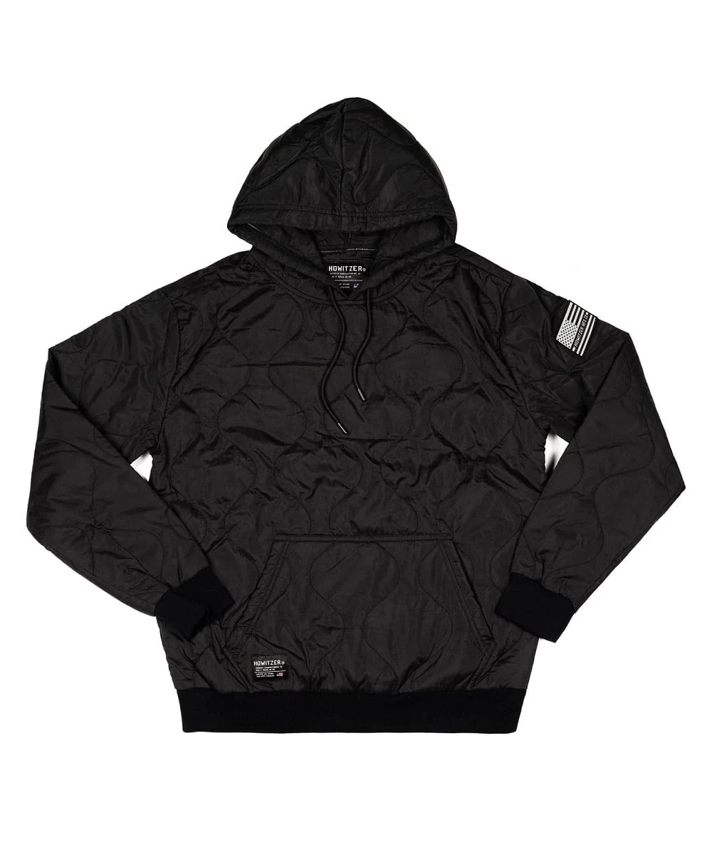 Quilted Shell: 100% Nylon ; Contrast: 83% Polyester/17% Spandex; Lining: 100% Polyester; Drawstring Hood; Front Kangaroo Pouch Pocket; Elastic Rib Knit Cuffs And Waist; Subdued Howitzer Logo Flag Patch On Left Arm; Howitzer Donates 5% Of Their Proceeds To Charities And Non Profits To Benefit American Heroes Who Sacrifice To Protect Us: Wishes for Warriors, Rise Above Hardship, National Law Enforcement Memorial Fund And National Fallen Firefighters Foundation; Color; Black; Style #371OW105