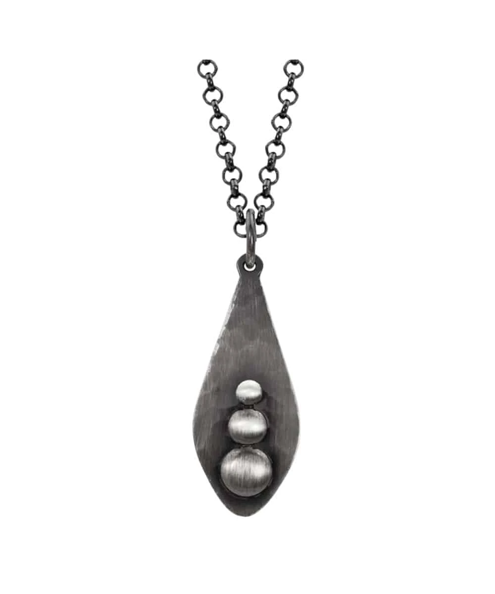 Gunmetal Over German Silver Base; Rhodium Over Brass Base; Teardrop Pendant; Slightly Hammered Texture; 3 Stacked Beads With Brushed Gunmetal Finish; Back Of Pendant Has Filigree Design; 28″ Gunmetal Style Chain; Style #NC4223MA