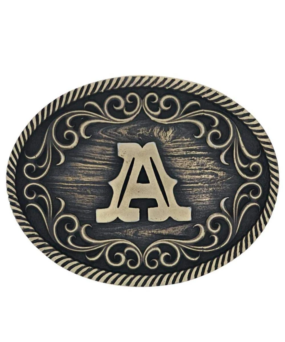Brass Over White Metal Alloy; Oval Belt Buckle; Silver/Gold Toned With Rope Trim; Big, Bold Classic Filigree; A Initial In Center; Standard 1.5″ Belt Swivel; Measures Approximately: 3.8″ W x 2.96″ H; Style #A915A