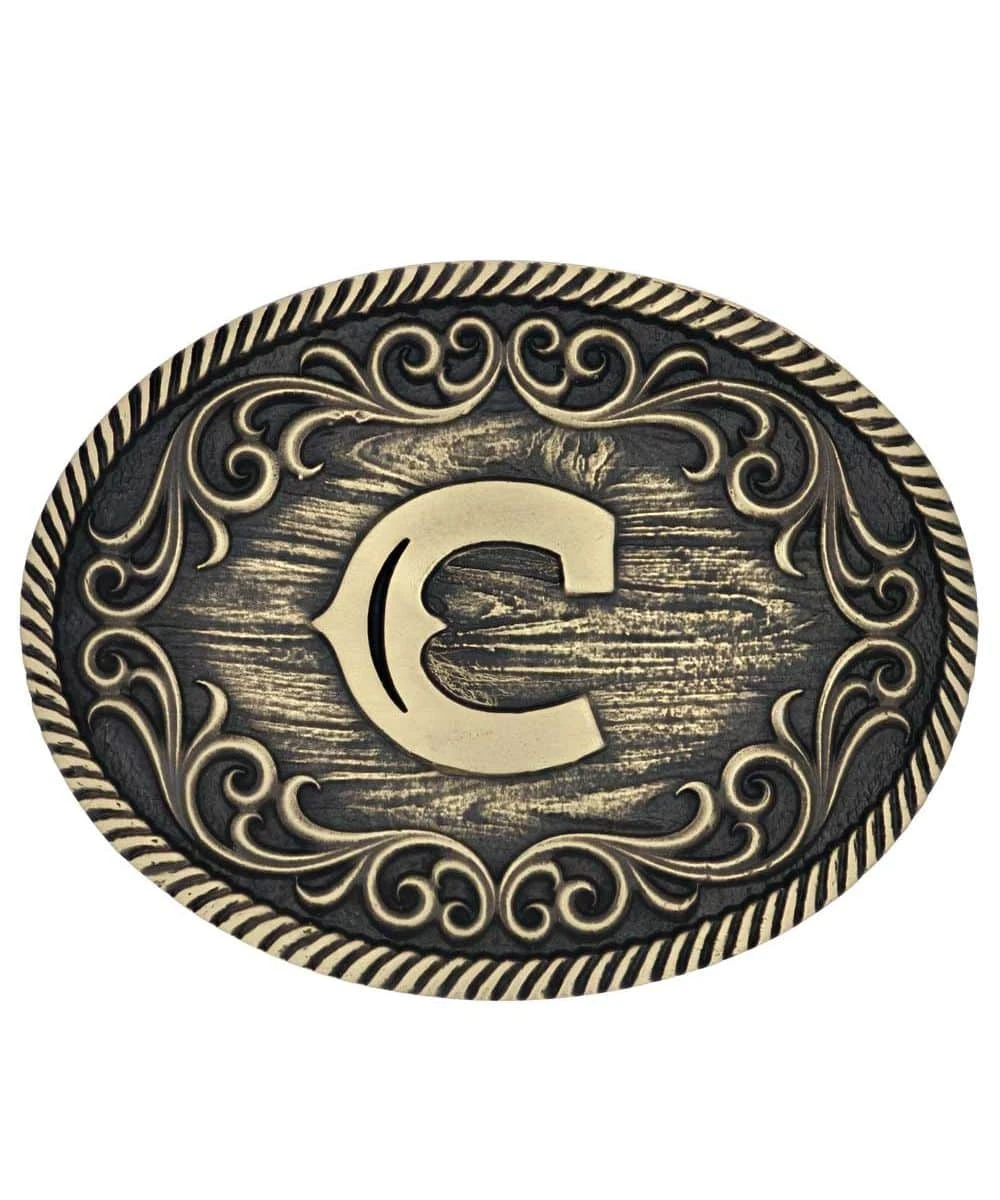 Brass Over White Metal Alloy; Oval Belt Buckle; Silver/Gold Toned With Rope Trim; Big, Bold Classic Filigree; C Initial In Center; Standard 1.5″ Belt Swivel; Measures Approximately: 3.8″ W x 2.96″ H; Style #A915C