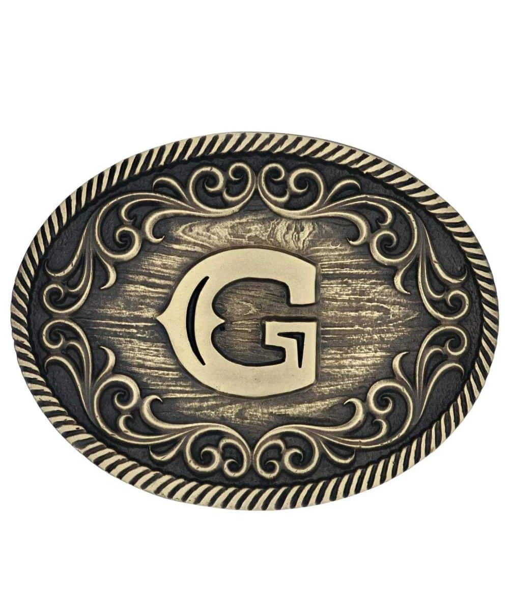 Brass Over White Metal Alloy; Oval Belt Buckle; Silver/Gold Toned With Rope Trim; Big, Bold Classic Filigree; G Initial In Center; Standard 1.5″ Belt Swivel; Measures Approximately: 3.8″ W x 2.96″ H; Style #A915G