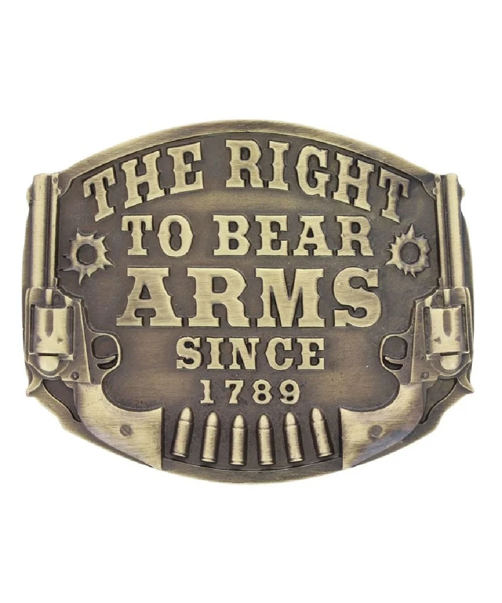 Brass Plate Over A Solid Cast White Metal Alloy Base; Antiqued Bronze Finish; “The Right To Bear Arms Since 1789″ Front And Center Of Buckle; Two Upright Pistols Decorate Each Side; Row Of Six Bullets Across The Bottom; Standard 1.5” Belt Swivel; Style #A603C
