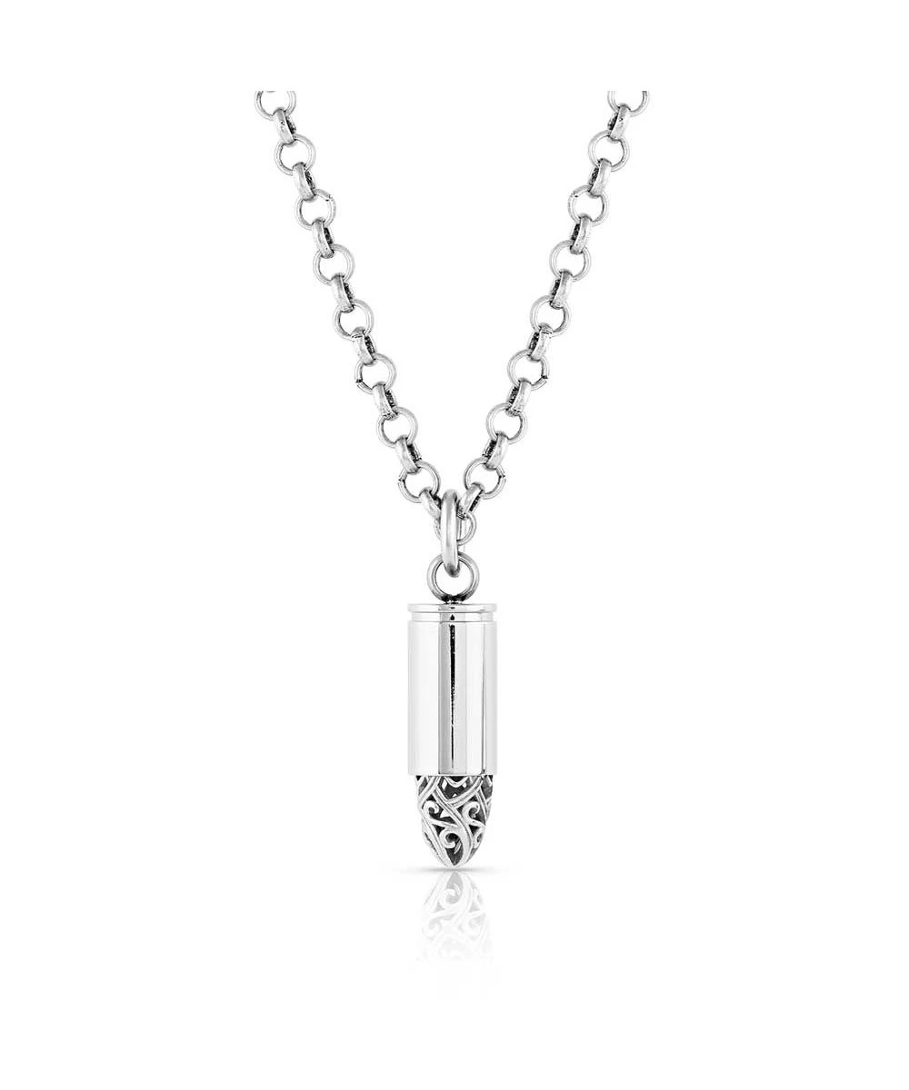 Rhodium Brass Base; Bullet Pendant Style Silver Toned Necklace; Bullet Is Shiny, Bounces Reflections; Wire Filigree Accent At Tip; 18.5″ Chain; Style #NC5102