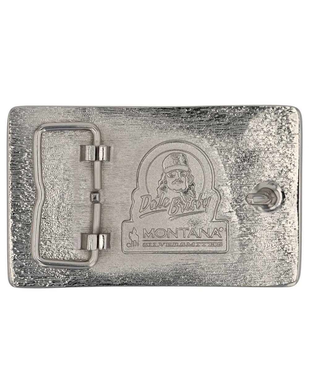 Silver And Gold Over White Metal Alloy; Inspired By Cultural Colors Of Dale Brisby’s Home State, Texas; Rectangle Shaped Southwestern Belt Buckle With Silver Tone Filigree Trim; Silhouette Of Texas Bull With Mountains Cradled By Green, Orange, And Red Vibrant Colors; “Rodeo Time” Sits Along The Bottom In A Gold Tone; Standard 1.5″ Belt Swivel; Measures Approximately: 4.25″ W x 2.6″ H; Style #A919DB