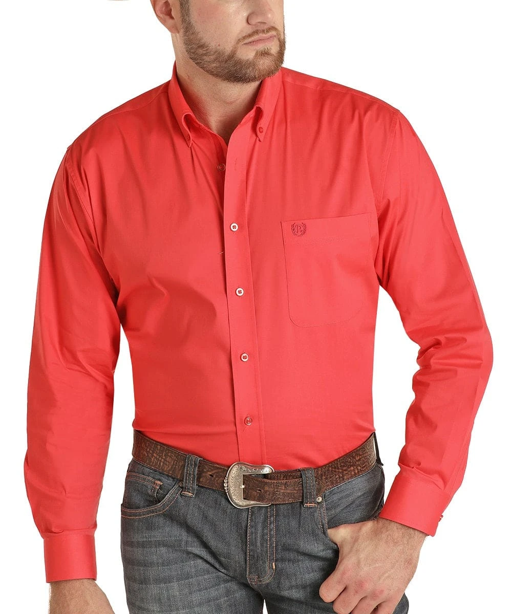 97% Cotton/3% Spandex; Button Down Collar; Button Cuffs; Single Open Pocket With Panhandle Embroidery; Color: Red; Style #36D9341