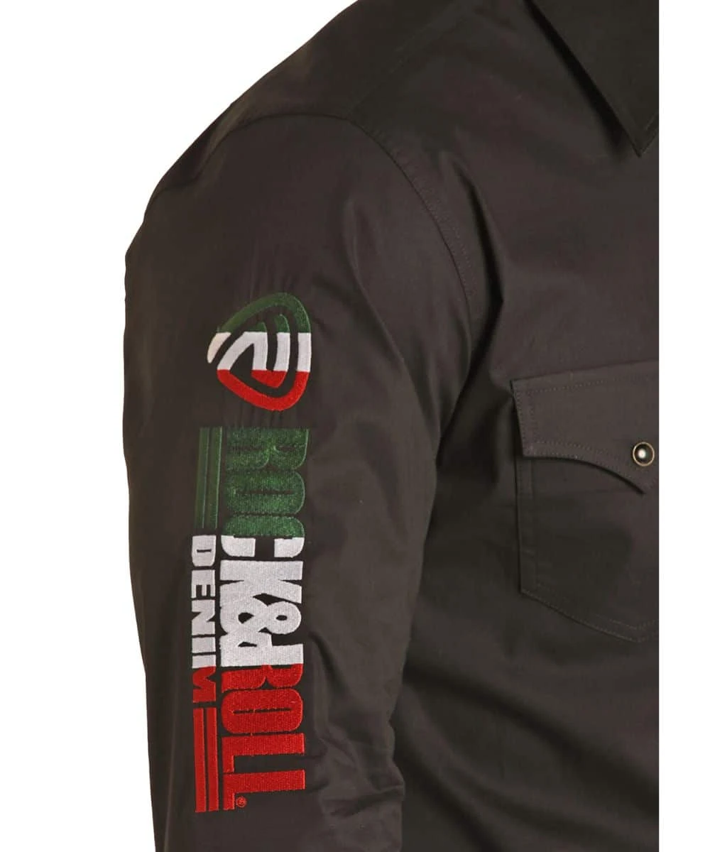 97% Cotton/3% Spandex; Woven Stretch; Modern Fit; Long Sleeve; Spread Collar; Snap Front Placket And Cuffs; Black Pearl Snaps; Dual Single Point Snap Flap Chest Pockets; Single Point Front And Back Yokes; Mexico Flag Colored (Green, White, And Red) Logo Embroidery On Right Sleeve; Color: Black; Style #RRMSOSR0QT