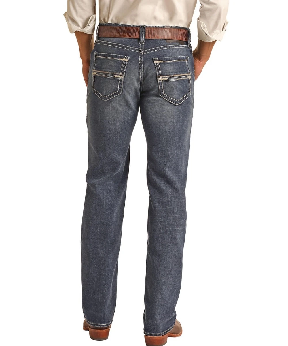 99% Cotton/1% Spandex; Reflex Stretch Denim; Mid Rise; Regular Fit; Color: Dark Vintage; Straight Raised Embroidered Pockets; Five Pocket Styling; Straight Leg; Style #RRMD1PR142