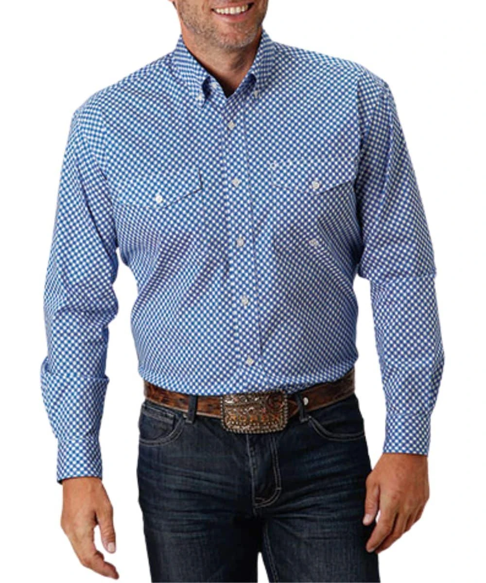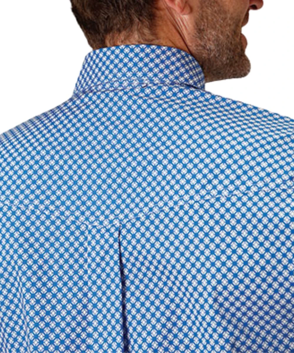 97% Cotton/3% Spandex; Long Sleeve; Button Down Collar, Placket, And Cuffs; Dual Single Point Button Through Flap Chest Pockets; Logo Embroidery; Single Point Back Yoke With Pleat And Locker Loop; Color: Blue Diamond Star Geo Print; Style #03-001-0325-2022