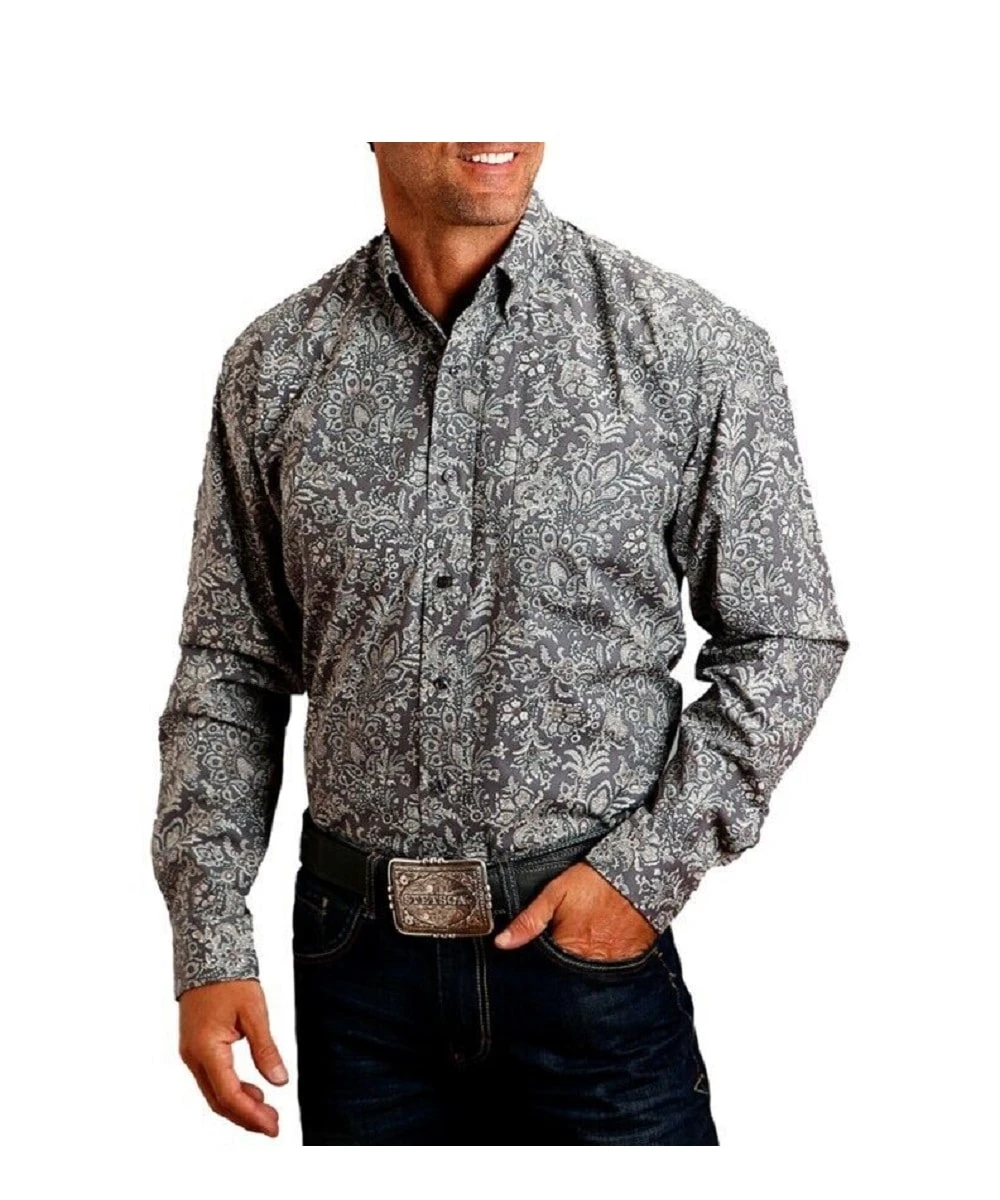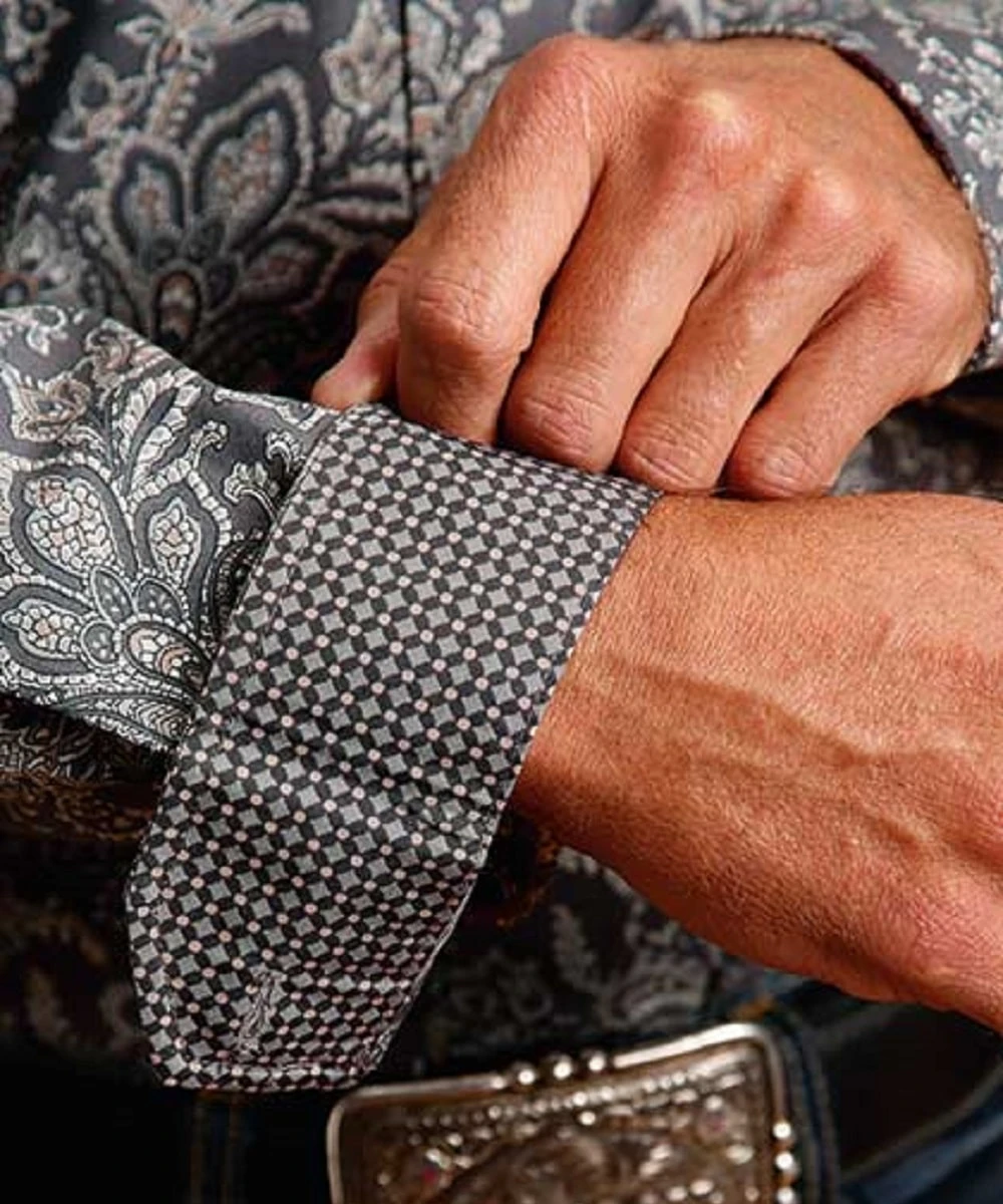 100% Cotton; Regular Fit; Long Sleeve; Button Down Collar; Pearl Button Down Front Closure; One Open Chest Pocket With Logo Embroidery; Logo Embroidery On Right Sleeve Placket; Straight Back Yoke With Pleat; Two Button Adjustable Mitered Edge Cuff; Contrast Inside Trim; Paisley Print; Color: Grey; Style #11-001-0526-1052
