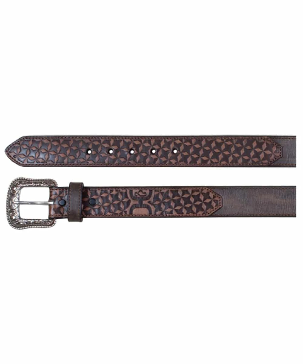 Leather; Dark Brown Wash; Lighter Brown Tooled Geometric Pattern Design Tips; Hooey Logo; Style #1833BE7