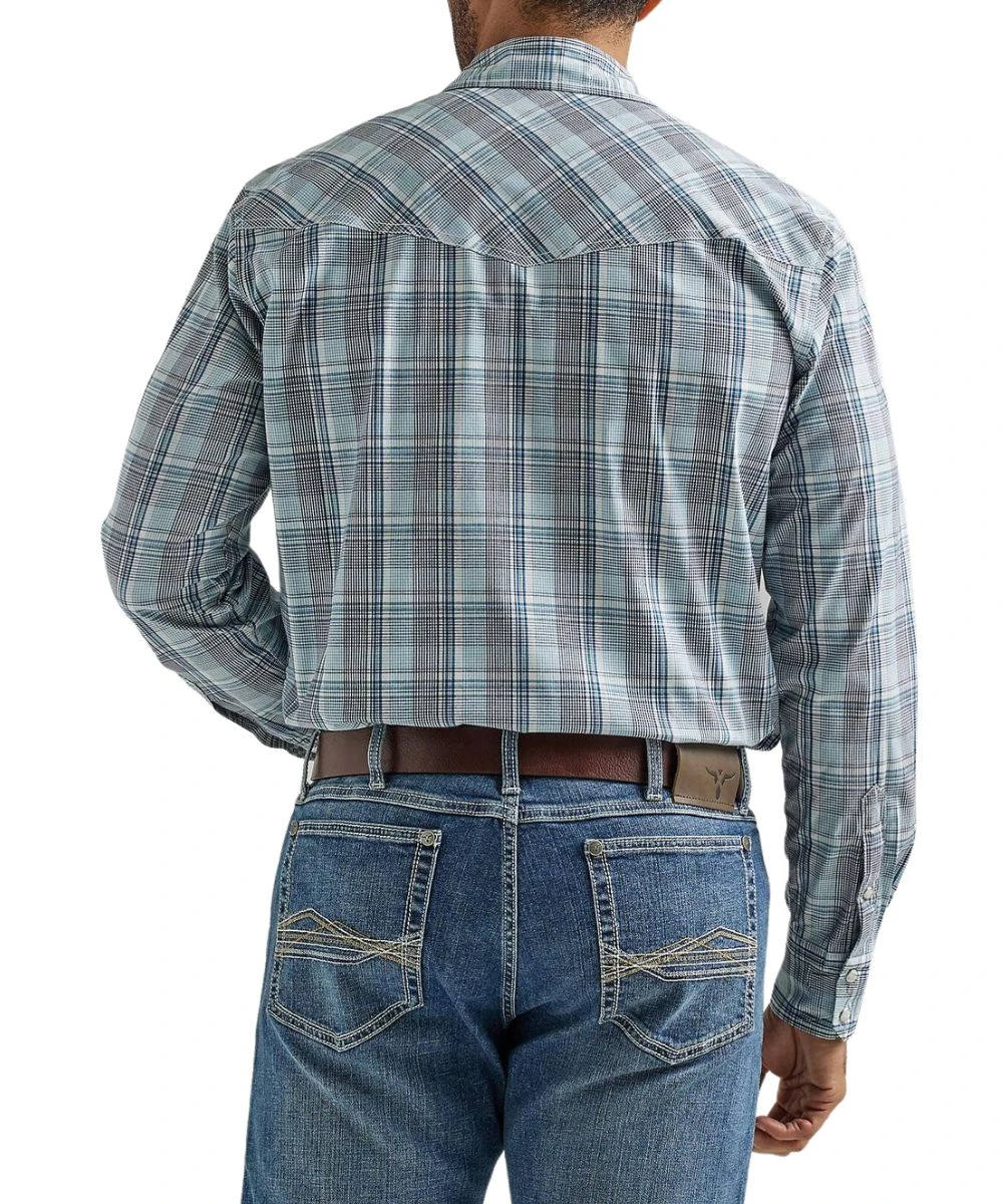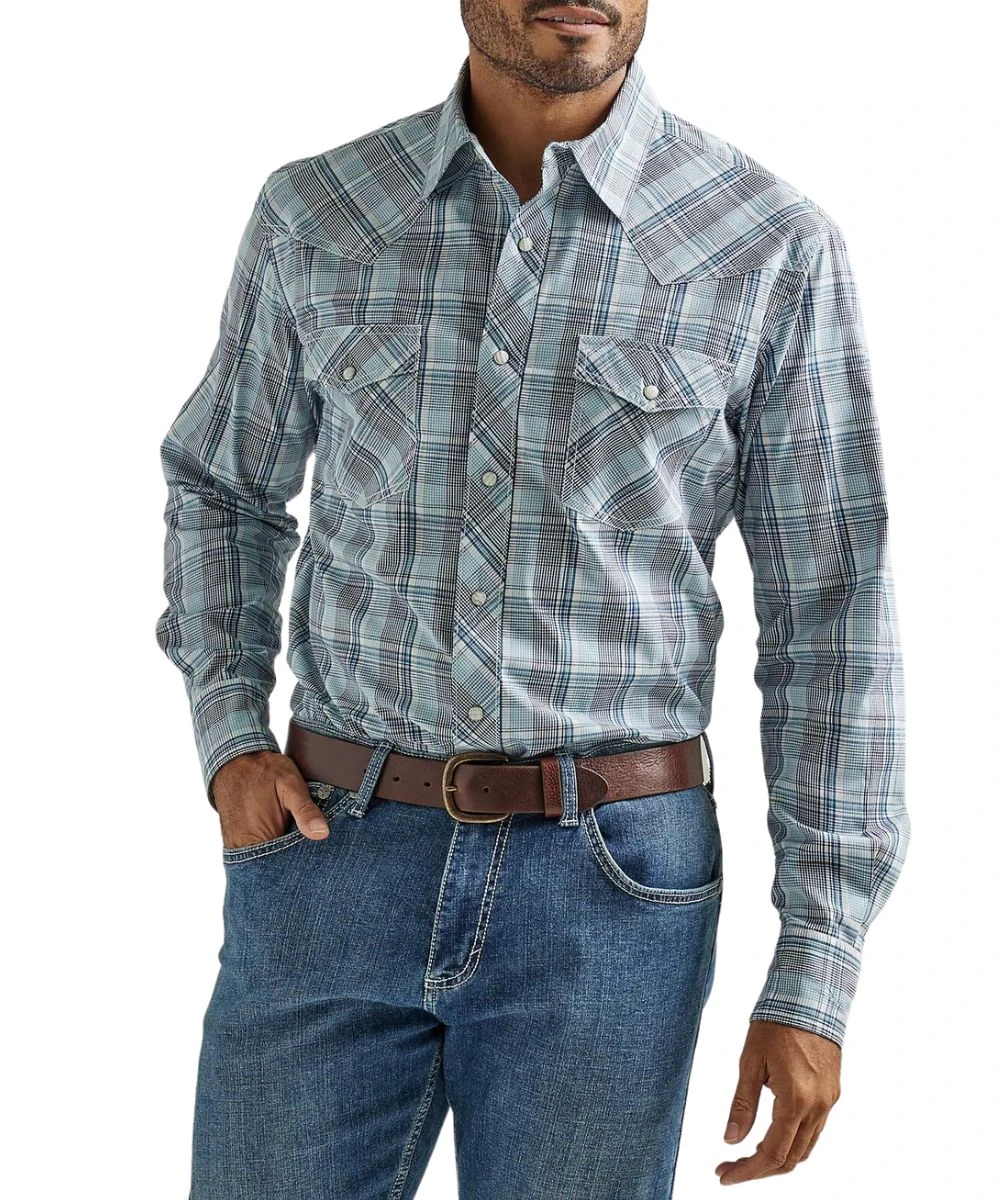 97% Cotton/3% Spandex; Slim Fit; Long Sleeve; Spread Collar; Snap Front Placket And Cuffs; Dual Single Point Snap Flap Chest Pockets; Single Point Front And Back Western Yokes; Competition Advanced Comfort; Color: Blue Sea Navy Plaid; Style #112327800