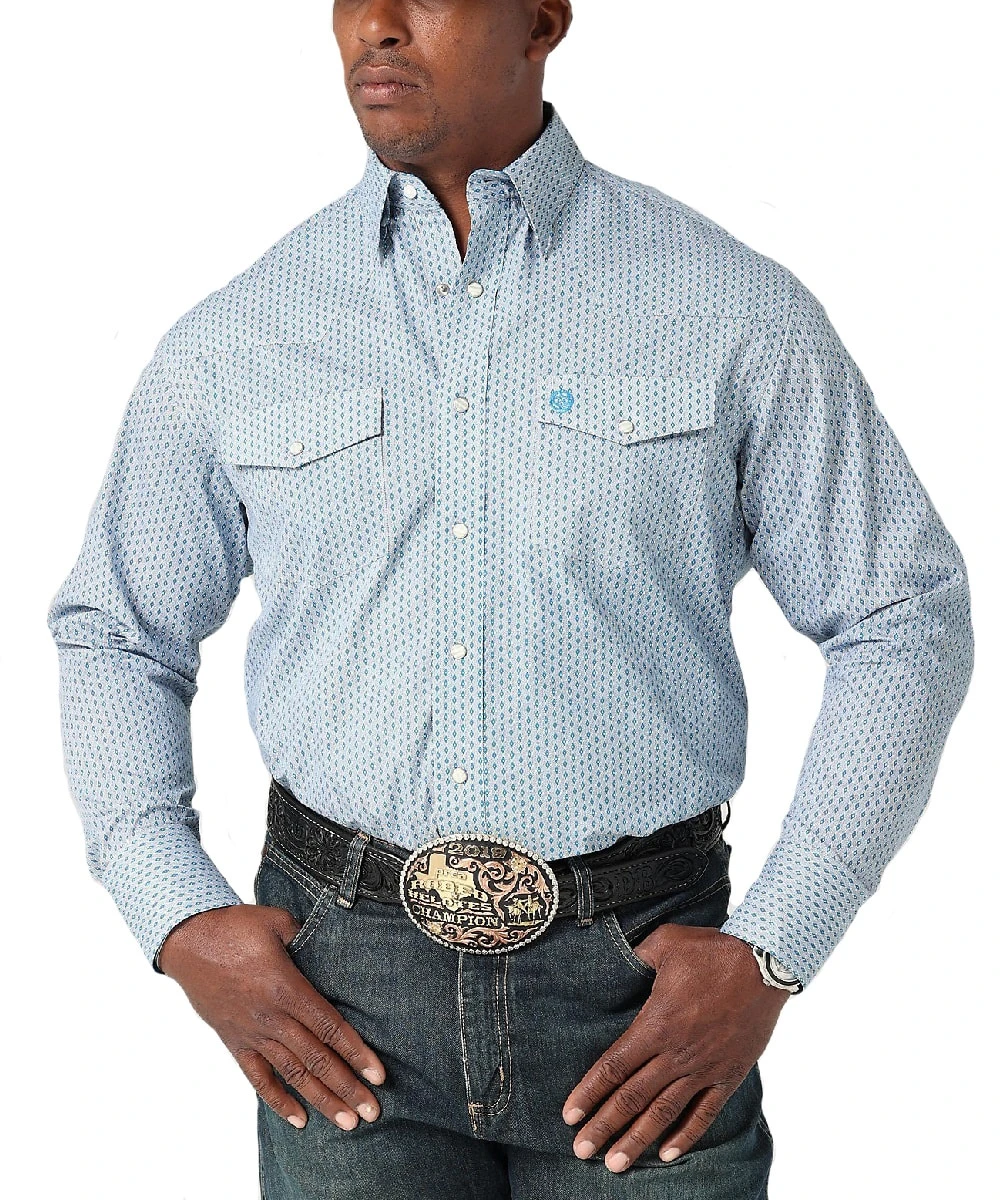 85% Cotton/15% Polyester; Long Sleeve; Spread Collar; Snap Front And Cuffs; Two Snap Flap Chest Pockets With Logo Embroidery; Single Point Front Yoke; Straight Back Yoke; Blue Geometric Diamond Print; Contrast Trim On Cuffs; Color: Blue/Tranquil Diamond; Style #112317163