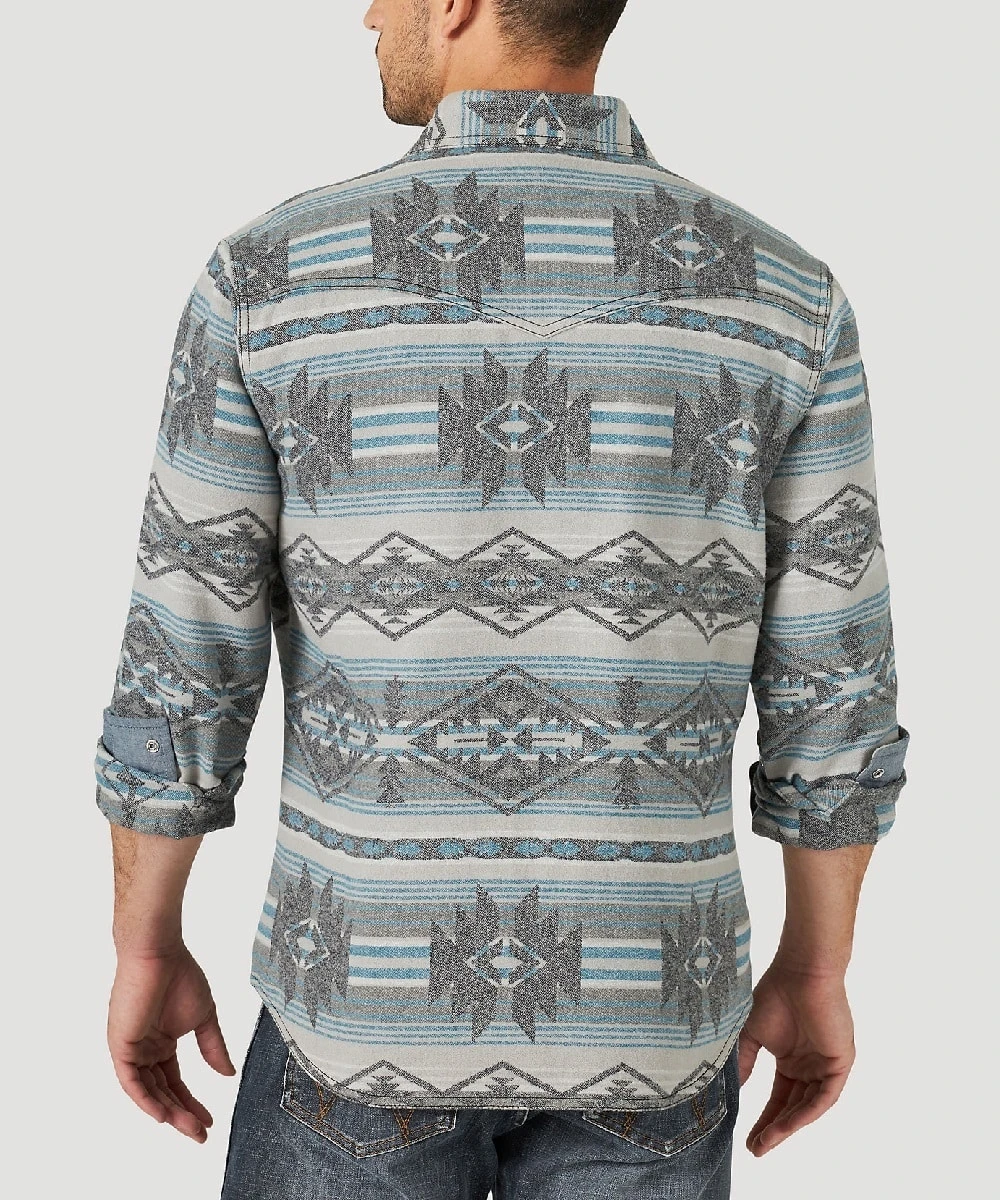 100% Cotton; Slim Fit; Long Sleeve; Spread Collar; Black Snap Front And Cuffs; Two Single Point Snap Flap Chest Pockets; Single Point Front And Back Yokes; Grey And Turquoise Aztec Print; Color: Dark Shadow; Style #112318897